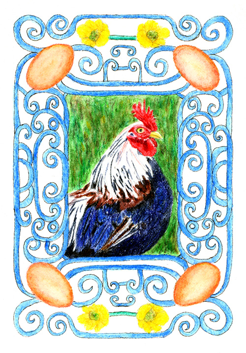 ![]() ROOSTER WITH BORDER oswoa, watercolor and inks 2012 H: 6" W: 4" |