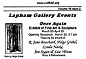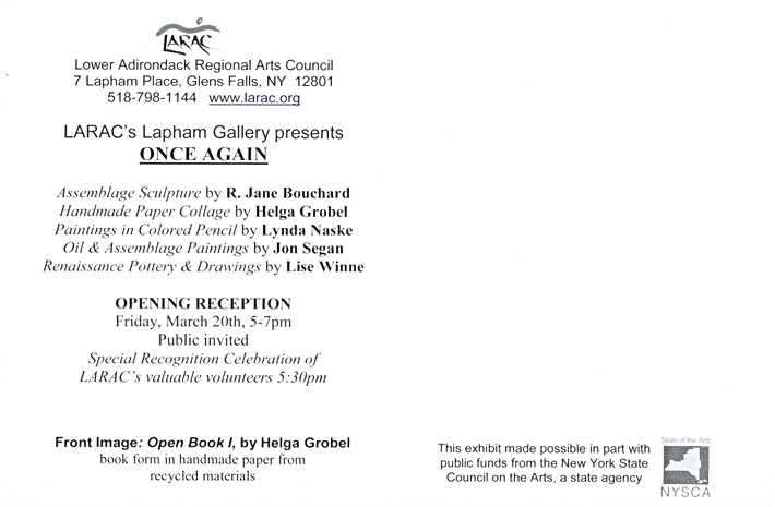 From March 20 – April 25 I was in a 5-person invitational juried art exhibit called Once Again at Lower Adirondack Regional Art Center (LARAC). I went “all out” for this exhibit, showing sculpture, pottery, paintings, prints and 48 new greeting card designs all relating to a Renaissance Faire banquet. Here a few pictures from the event (click on thumbnails for larger view):