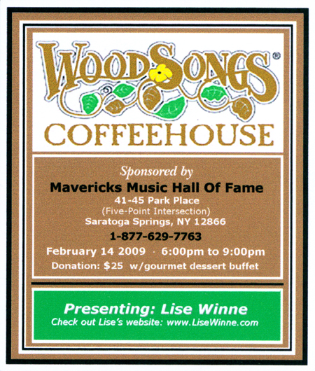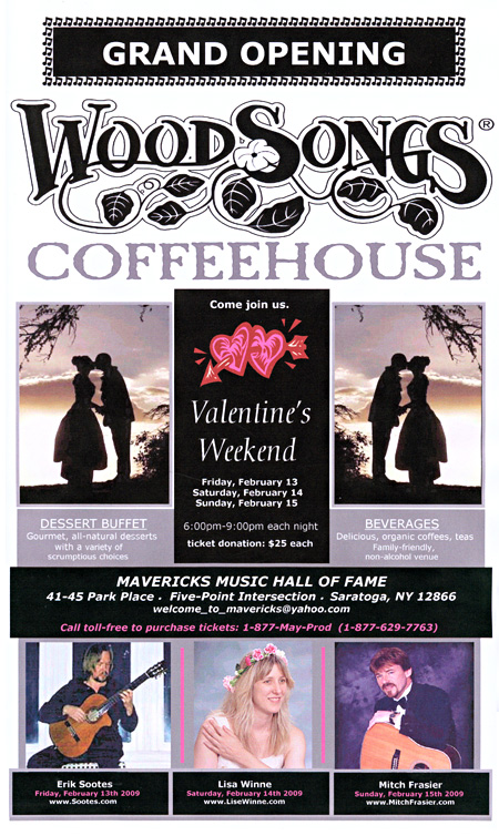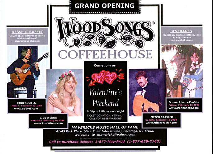 In February, Jim and I performed for the grand opening of a new Woodsongs Coffeehouse called Mavericks Music Hall of Fame. Also performing at the grand opening was Erik Sootes. Here are some of the posters, tickets, etc which I thought were nicely designed by Donna Marie Seakan (click on thumbnails for a larger view):