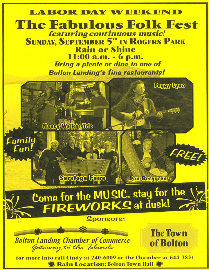 In September, as part of a Labor Day celebration, we (Saratoga Faire) performed for a folk festival in Bolton Landing. Here is the poster from the concert at Bolton Landing (click on thumbnail for a larger view):